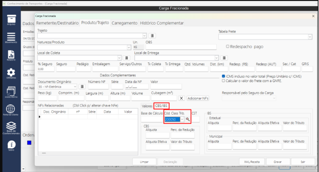 Ao preencher o Cód. Class.Trib padrão dentro dos parâmetros, ao entrar na rotina de Movimento>Carga Fracionada>Craga Fracionada, na aba de Produto/Trajeto> CBS/IBS o Cód. Class. Trib. virá preenchido automaticamente.
