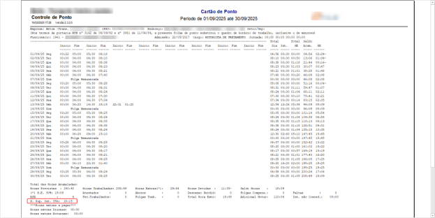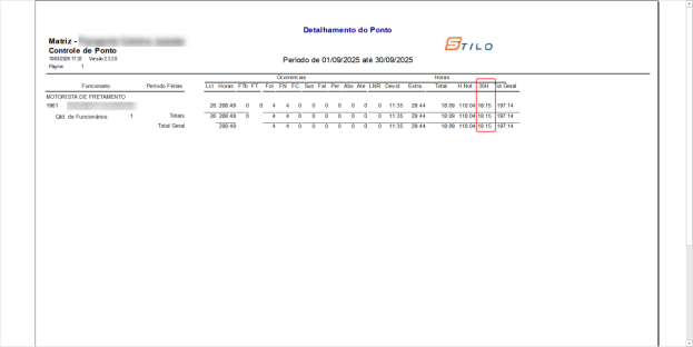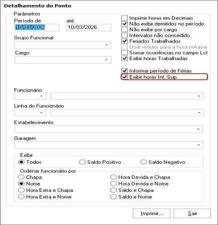 Com o parâmetro marcado, ao gerar o relatório ira puxar a informação referente ao H. Sup. Int. 35h que consta no cartão de ponto.