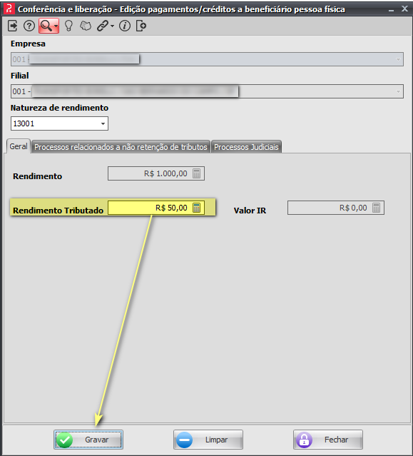 4 - Será exibida uma nova tela. No campo Rendimento Tributado, informe o valor desejado;
