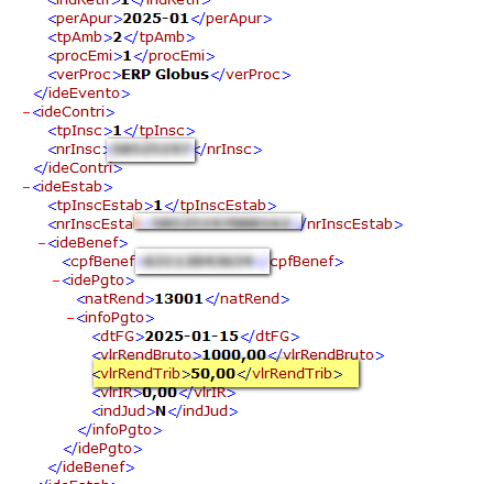 Ao efetuar o envio, será possível verificar que a geração do XML contemplará o correto preenchimento da tag vlrRendTrib, conforme as informações inseridas.