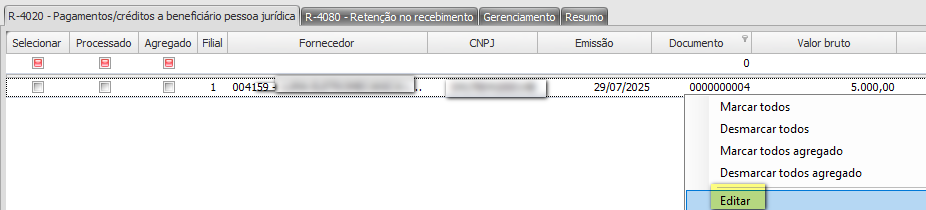 2 - Selecione o documento no qual deseja informar o valor a Base de IR;