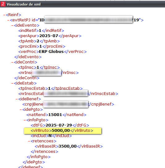 Ao efetuar o envio, será possível verificar que a geração do XML contemplará o correto preenchimento da tag vlrBruto, conforme as informações inseridas.