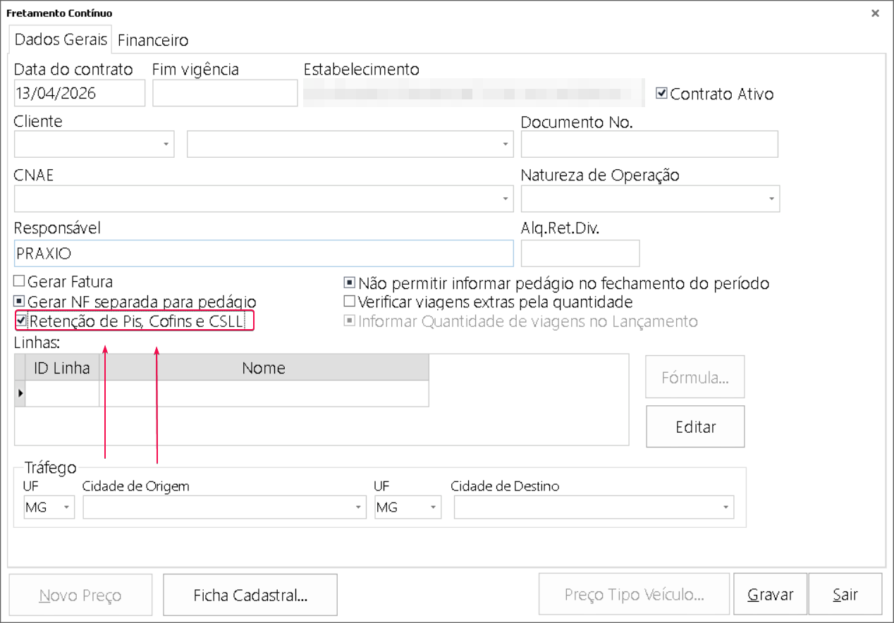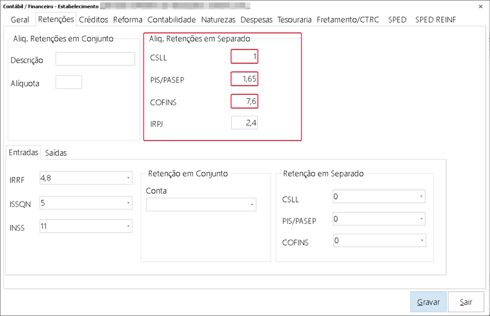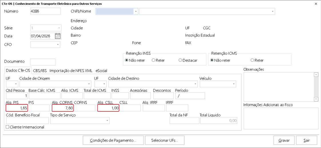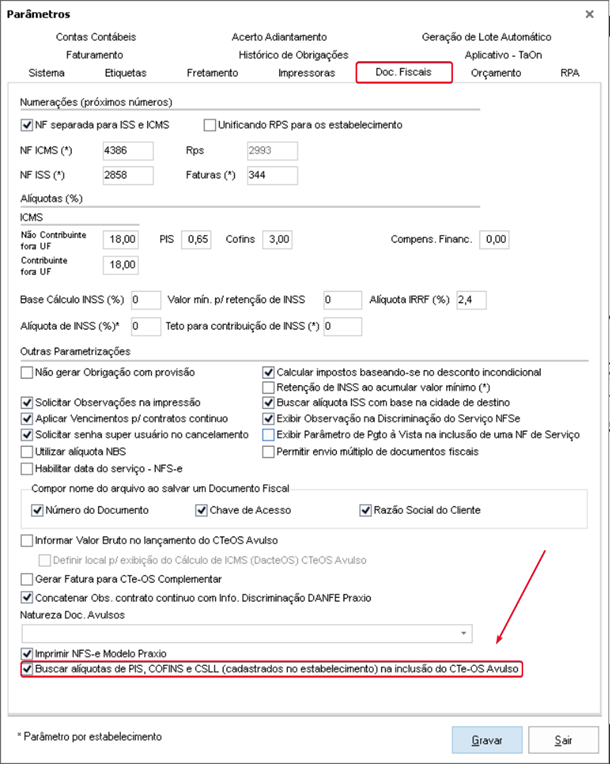 O desenvolvimento desta funcionalidade tem como objetivo a inclusão dos campos PIS, COFINS e CSLL no CTE-OS. Como se trata de uma rotina amplamente utilizada sem esses campos, foi necessária a criação de uma parametrização para garantir flexibilidade no uso. Configuração:Utilitários > Parâmetros > Doc. Fiscais: “Buscar alíquotas de PIS, COFINS e CSLL (cadastradas no estabelecimento) na inclusão de CTE-os avulso” ![]() Este parâmetro determina se as alíquotas cadastradas no estabelecimento serão pré-carregadas dentro do Cte-OS. Ou seja, com o parâmetro desmarcado os campos serão exibidos, mas as alíquotas não serão pré-carregadas, deixando o campo vazio. Com ele marcado, será pré-carregado as alíquotas: Cadastro estabelecimento: