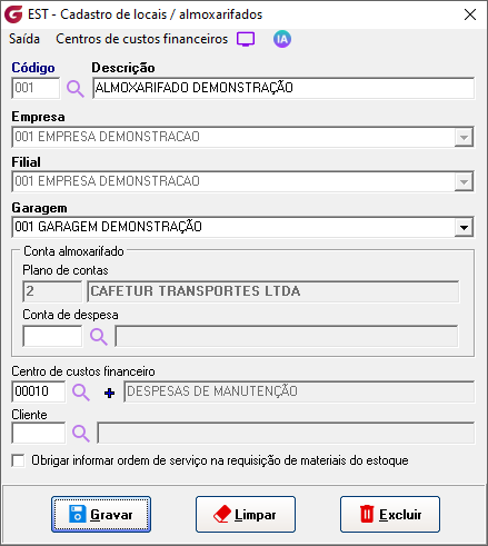 Código - Informe um código ou clique no botão de pesquisa para selecionar um local já cadastrado para consulta ou alteração. Descrição - Campo para informar o nome do local Empresa - Campo para selecionar a empresa Filial - Campo para selecionar a filial Garagem - Campo para selecionar a garagem Conta almoxarifado Plano de contas - Código e descrição do palno de contas cadastrado para a empresa/filial Conta de despesa - Campo para associar conta de despesa Centro de custo financeiro - Campo para associar um ou mais centros de custo financeiro Cliente - Campo para associa um cliente Obrigar informar ordem de serviço na requisição de materiais do estoque - Marque esta opção para não permitir gerar requisição de materiais sem associar uma ordem de serviço. Botão Gravar - Utilize o botão para confirmar um cadastro ou alteração Botão Limpar - Utilize o botão para limpar a tela sem gravar Botã excluir - Utilize o botão para excluir um cadastro