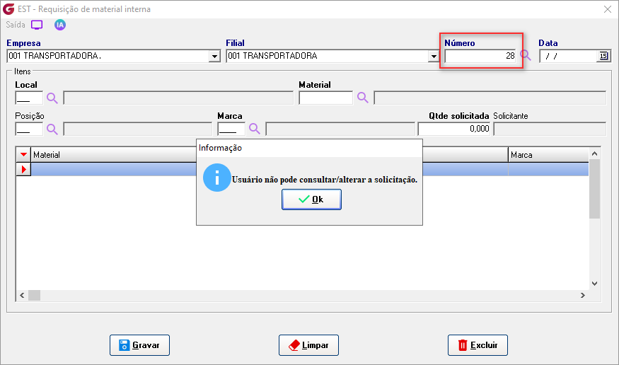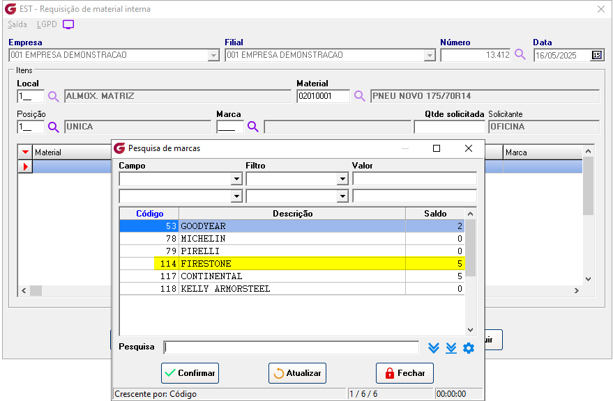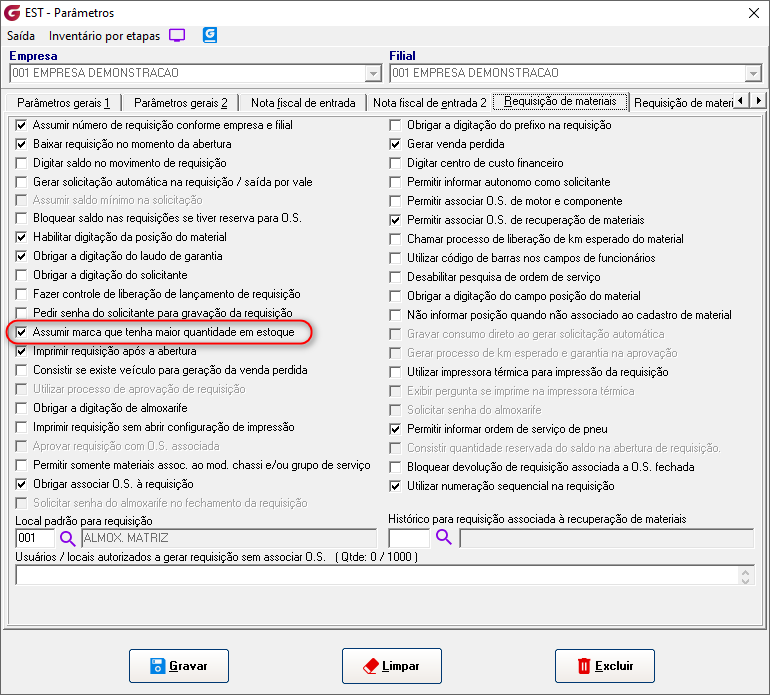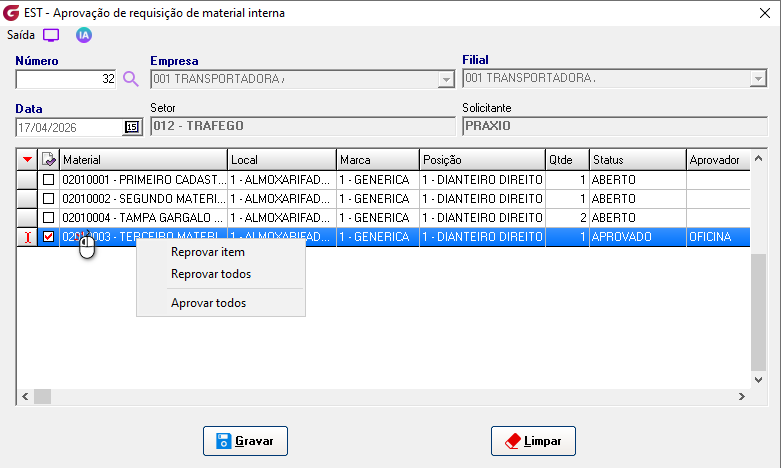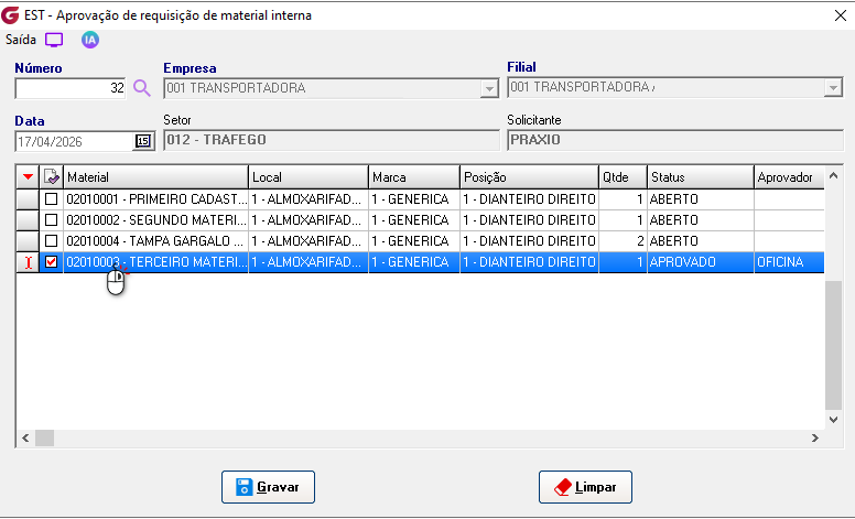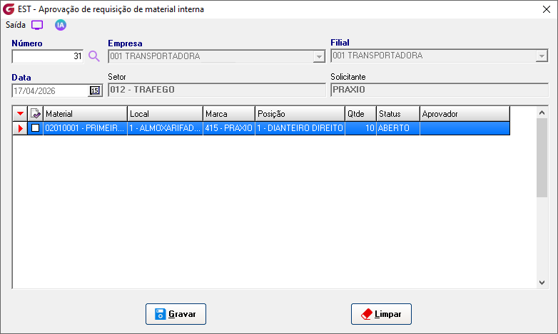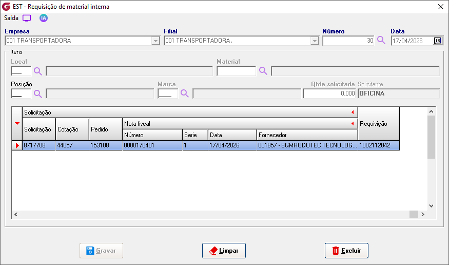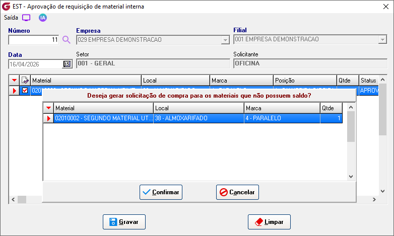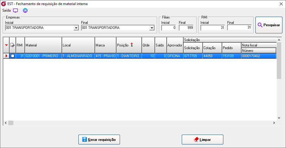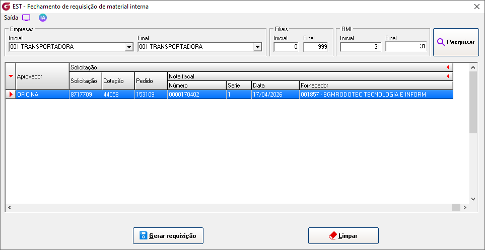 Cadastros>Responsáveis para aprovação de RMI Informe o usuário e associe os setores para permissão de autorização. ![]() Diários>Saídas>Solicitação de requisição de material interna Empresa - Selecione a empresaFilial - Selecione a filial Número - No campo é sugerida uma numeração sequêncial, para consultar ou alterar uma solicitação já aberta clique no botão de pesquisa e selecione. Obs:Só permitida consulta ou alteração da solicitação para funcionário do mesmo setor ou usuário autorizado para aprovação do setor. Local - Digite o local ou selecione pelo botão de pesquisaMaterial - Digite o código do material ou selecione botão de pesquisa Posição - Digite a posição ou selecione o local pelo botão de pesquisa Marca - Digite a marca ou selecione o local pelo botão de pesquisa, na pesquisa é possivel visualizar o saldo Qtde solicitada - informe a quantidade desejada Local - Digite o local ou selecione o local pelo botão de pesquisa Solicitante - Campo com a descrição do usuário que gerou a solicitação Material - Código e descrição do materialLocal - Código e descrição do local Posição - Código e descrição da posição Qtde - Quantidade solicitada Aprovador - Descrição do aprovador Status - Condição atual da solicitação Solicitação - Número da solicitação de compras associadaCotação - Número da cotação de compras associada Pedido - Número do pedido de compras associado Nota fiscal - Número, série, data de entrada, código e descrição do fornecedor Requisição - Número da requisição gerada Diários>Saídas>Aprovação de requisição de material interna Número - Informe o número da solicitação ou clique no botão de pesquisa para selecionarEmpresa - Código e descrição da empresa Filial - Código e descrição da filial Data - Data da geração da solicitação Setor - Código e descrição do setor Solicitante - Descrição do usuário solicitante Grid Material - Código e descrição do item Local - Código e descrição do local Marca - Código e descrição da marca Posição - Código e descrição da posição Qtde - Quantidade solicitada Status - Condição atual da solicitação Aprovador - Descrição do usuário aprovador Clique com o botão direito do mouse sobre o item para aprovar Clicando com o botão esquerdo é possível reprovar um item já aprovado, reprovar todos ou aprovar todos. ![]() Para os itens que estiverem sem saldo, ao aprovar será gerada solicitação de compras. ![]() Diários>Saídas>Fechamento de requisição de material interna Empresas | Inicial / Final - Selecione as empresasFiliais | Inicial / Final - Selecione as filiais RMI | Inicial / Final - Selecione as requisições e clique no botão "Pesquisar" GRID RMI - Número da requisição Material - Número e descrição do material Local - Número e descrição do local Marca - Número e descrição da marca Posição - Número e descrição da posição Qtde - Quantidade solicitada Saldo - Saldo atual do item Aprovador - Descrição do aprovador ![]() Solicitação - Número da solicitação de compras gerada Cotação - Número da cotação gerada Pedido - Número do pedido de compras gerado Nota fiscal - Número , série, data de lançamento, código e decrição do fornecedor Botão "Gerar requisição" - Selecione o item e clique no botão para gerar a requisição, em seguida finalize a rotina de requisição de materiais. Parâmetros>Estoque>Parâmetros gerais 2 Com o parâmetro "Solicitar ao aprovador da RMI confirmação para gerar solicitação de compra" marcado, na rotina de aprovação é solcitada confirmar para geração de solicitação de compras.![]() Com o parâmetro "Bloquear alteração de status de RMI ao excluir solicitação associada" marcado , o status da solicitação de requisição de material interna não será atualizado. ![]() Parâmetros> Estoque> Requisição de materiais ![]() Com o parâmetro marcado, ao informar o item e posição, o campo marca é preenchido automaticamente com a marca de maior quantidade em estoque. Se mais de uma marca com a mesma quantidade será apresentada a primeira marca encontrada.
